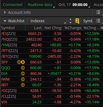 Comments: So, it is a flat opening today. Bitcoin is down again, retesting the 200-day SMA. The government is still shut down, but the treasury actually reported a surplus due to the tariffs which means the military can get paid. (I think we should pay the military, before we pay Congress and their staff, but what do I know?)