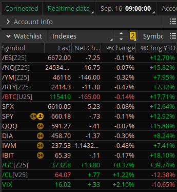 Comments: The open is hovering around “unchanged” across the board. I know there’s a lot of red, but the percentage drop is low enough that this is basically sideways. The market is sitting on its hands in anticipation of tomorrow’s Fed announcement. It’s a really good day to go kayaking and listen to the sweet sound of premium decay (ha ha).